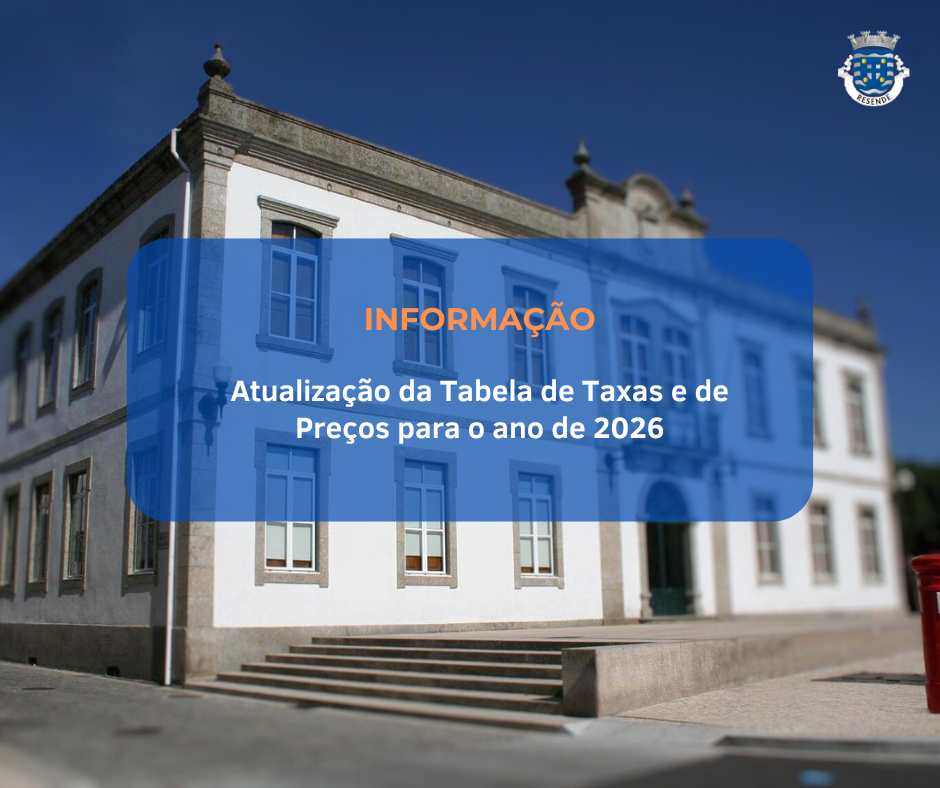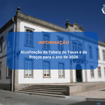 Informamos que, de acordo com as deliberações da Câmara Municipal e Assembleia Municipal de 22 de novembro e 29 de dezembro de 2025, respetivamente, o Município procedeu à atualização da Tabela de Taxas e de Preços para o ano 2026, que entra em vigor no próximo dia 30 de janeiro de 2026.