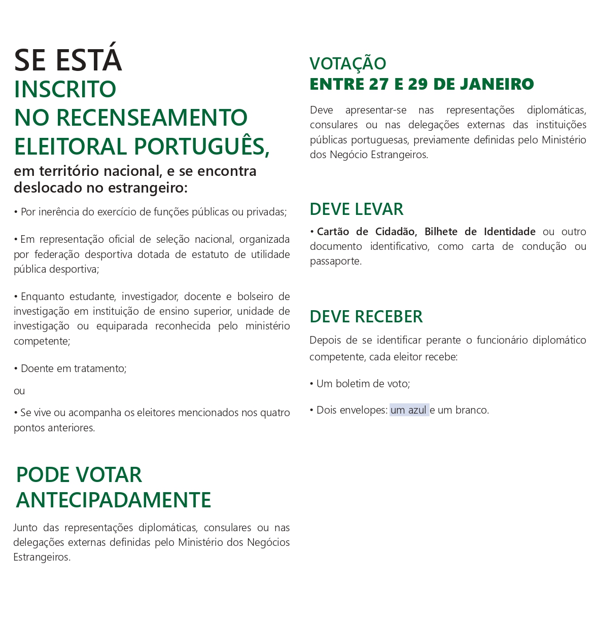 Eleitores deslocados no estrangeiro – votações de 27 a 29 de janeiro;