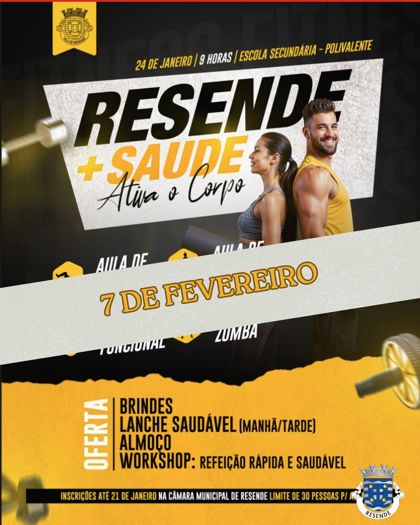 Relembramos todos os inscritos no evento Resende + Saúde | Ativa o Corpo que a atividade decorrerá amanhã, dia 7 de fevereiro.